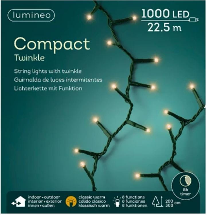 Met 1000 lampjes kan je een boom van 2 á 3 meter vullen. Afhankelijk van de hoeveelheid licht die je graag in je boom wilt hebben. Het warme licht doet denken aan de ouderwetse kerstboomlampjes en zijn perfect voor het uitlichten van je kerstballen. Met de 8 verschillende functies kan je je lampjes snel of langzaam laten twinkelen. De kerstverlichting is voor binnen en buiten geschikt.