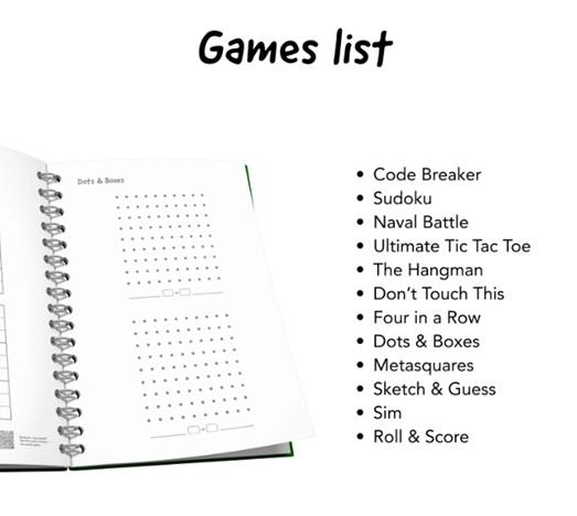 - Spellen: Codekraker, Sudoku, Zeeslag, Ultimate Boter Kaas en Eieren, Galgje, Don’t Touch This, Vier op een Rij, Kamertje Verhuren, Metavlakken, Pictionary, Sim, Yahtzee.