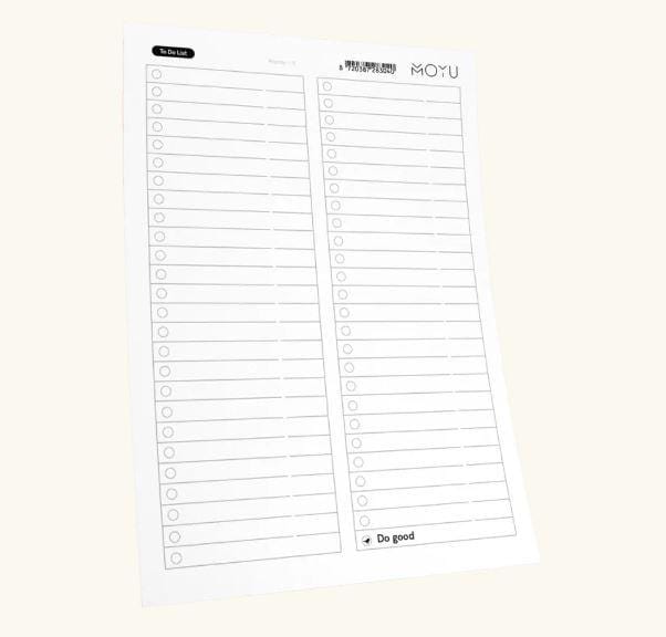 In een notendop: dit MOYU blad is milieuvriendelijk geproduceerd en kan ook nog eens jaren meegaan. De pagina is gemaakt van innovatief steenpapier, wat iets steviger en gladder aanvoelt dan regulier papier. De bladzijde blijft daardoor lang intact én je kunt de inkt volledig & vlekkeloos uitwissen met een vochtig doekje.