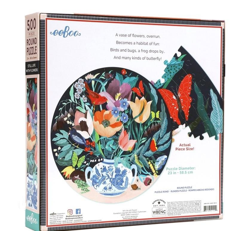 Laat je onderdompelen in de schoonheid van een bloemrijk stilleven met deze ronde puzzel van 500 stukjes. De puzzel zit verpakt in een compacte doos en toont een kleurrijke compositie van bloemen in klassieke schilderstijl. Ideaal voor puzzelliefhebbers die houden van kunstzinnige details en een iets andere vorm dan gebruikelijk.