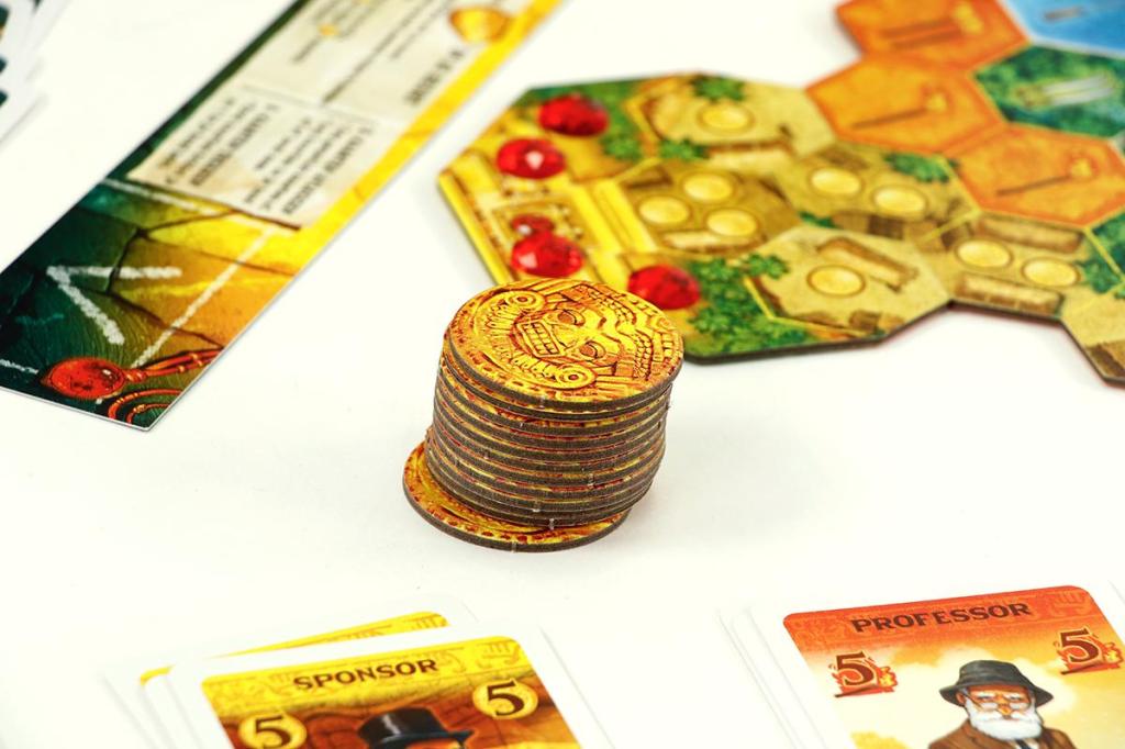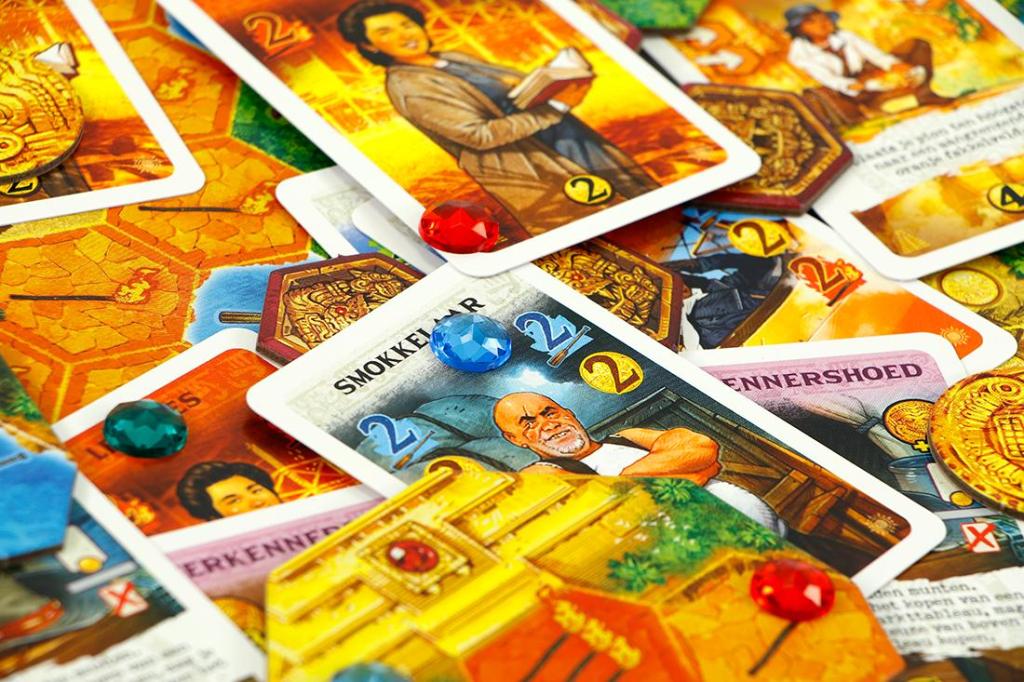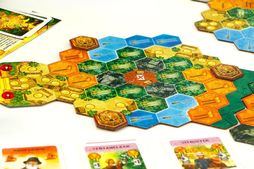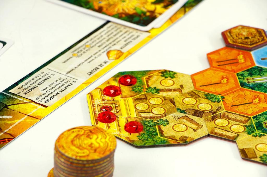 - Inhoud: -10 grote tegels, -12 edelstenen, -20 fiches, -8 speelstukken, -4 goudtegels, -4 expeditietableaus, -6 blokkades, -86 expeditiekaarten, -1 markttableau en de spelregels
