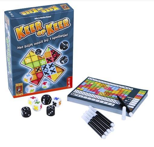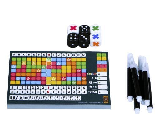 - Spelverloop: Kruis vakjes op je speelveld aan om zo snel mogelijk kolommen en gelijkgekleurde gebieden te vullen. Elke beurt kies je een gedobbelde kleur en een gedobbeld cijfer. Die combineer je, waardoor je aangrenzende vakjes van de gekozen kleur mag aankruisen. Maak steeds de juiste keuze en probeer de door de andere spelers gewenste combinatie weg te nemen. Je keuzemogelijkheden stijgen als je je speelveld verstandig uitbreidt. Naast punten voor complete kolommen krijg je ook een bonus als je alle vakjes van 1 kleur hebt aangekruist. Het spel is afgelopen als een speler 2 complete kleuren heeft aangekruist. Wie heeft de meeste punten?