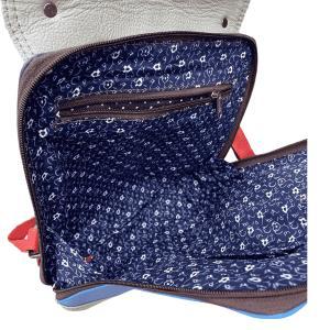 De flap sluit met twee gespen, terwijl een ritsvak op de achterzijde extra opbergruimte biedt. Binnenin vind je een ruim hoofdvak met een vrolijke donkerblauwe voering voorzien van witte bloemenprint, plus een afsluitbaar ritsvak voor kleinere spullen.