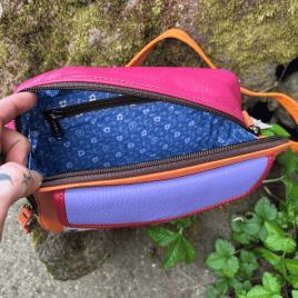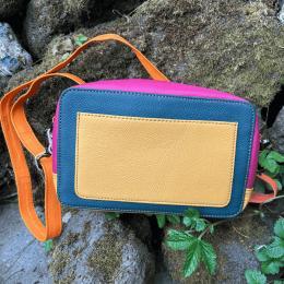 De Anika handtas in deze uitvoering is een echte blikvanger. De combinatie van oranje, paars en lichtblauw geeft de tas een frisse en speelse uitstraling, terwijl het model juist compact en praktisch blijft.