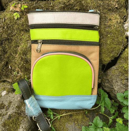 De Risha 6 is een frisse, opvallende variant binnen de Risha-serie. Het felle groen gecombineerd met zachte tinten maakt deze tas net even anders – zonder dat hij schreeuwerig wordt. Zoals altijd is elke tas gemaakt van restleer, dus je hebt iets echt unieks in handen. Het compacte formaat maakt ’m ideaal voor dagelijks gebruik. Alles wat je nodig hebt past erin, zonder dat je met een grote tas hoeft te slepen. Dankzij de meerdere ritsvakken houd je je spullen overzichtelijk en makkelijk bereikbaar. De verstelbare leren band met karabijnhaken zorgt ervoor dat je de tas zowel als heuptas of crossbody kunt dragen. Licht, stevig en comfortabel – precies wat je zoekt voor onderweg. De Risha 6 is fairtrade geproduceerd in India door Siddharth Imports en gemaakt van restleer. Dat betekent minder verspilling en een tas met karakter. Tip: smeer het leer af en toe in met kokosvet om het soepel en mooi te houden.