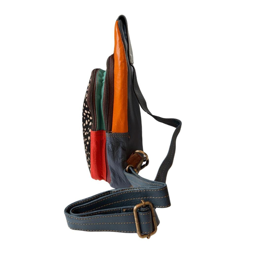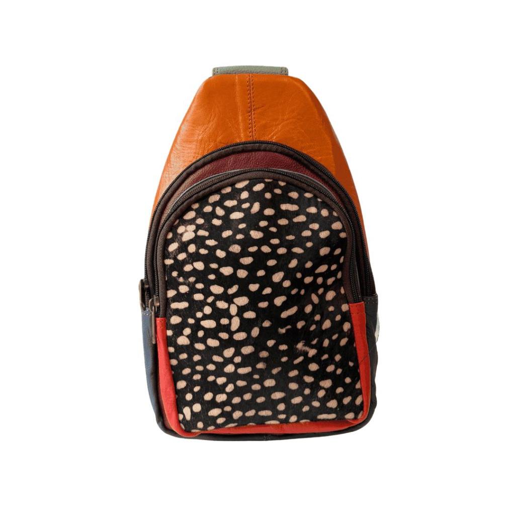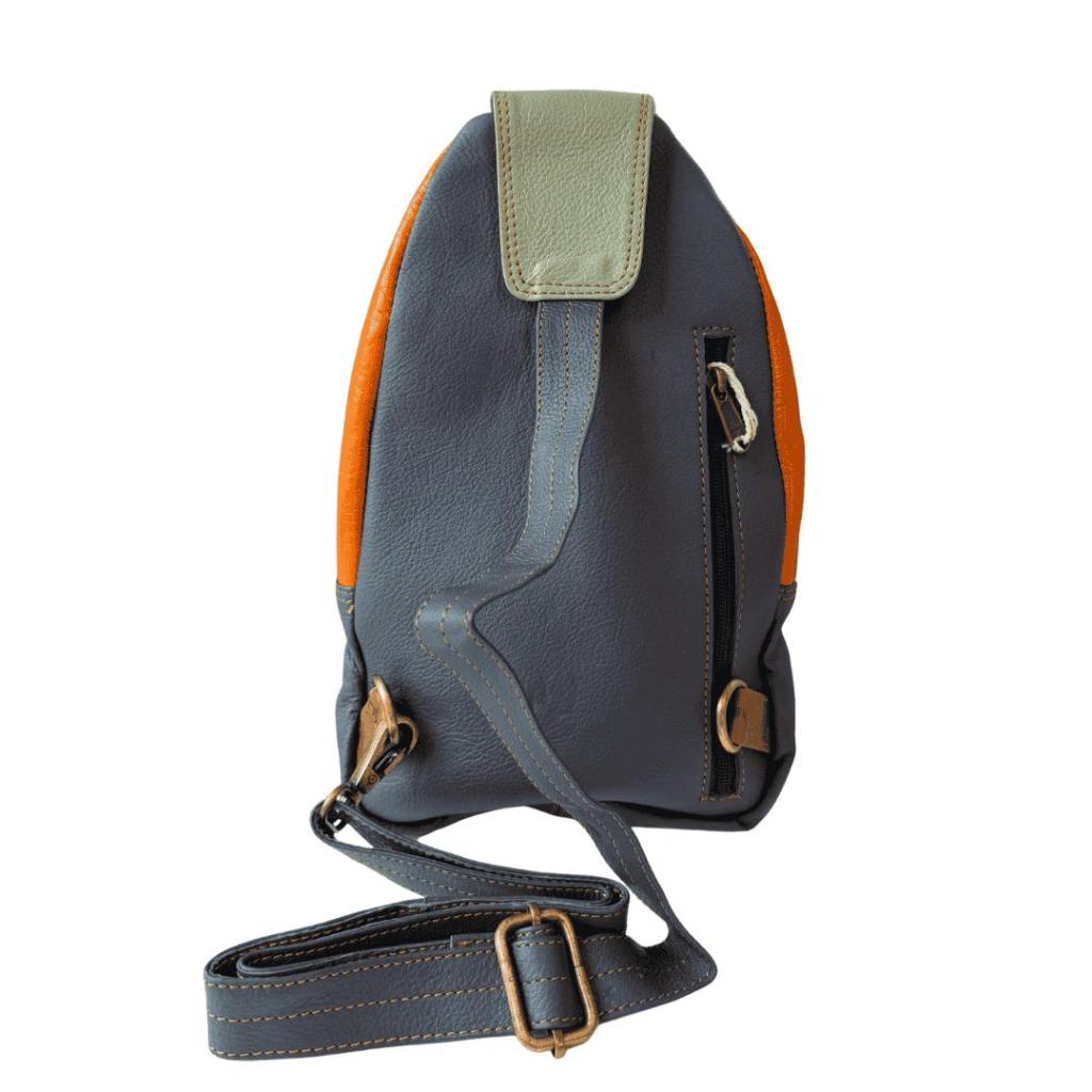De Jaina rugtas is een compacte tas met een speelse twist. Deze tweede variant valt op door de combinatie van warm oranje leer, donkerblauw en een opvallend patroon aan de voorkant. Klein van formaat, maar groots in uitstraling.
