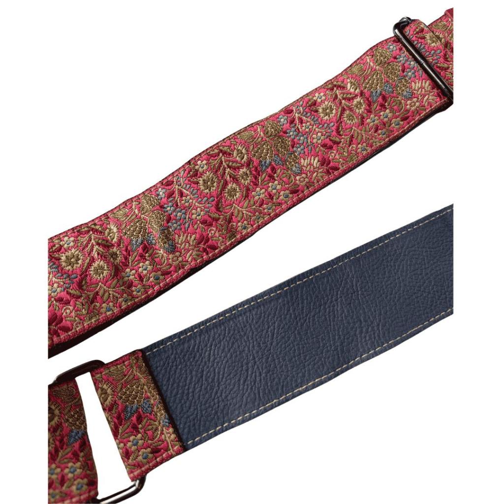 De leren schouderriem Sheetal 6 is een echte blikvanger. De voorzijde is uitgevoerd in een rijk rood textiel met fijn geborduurd bloemenpatroon in goud- en blauwtinten. De achterzijde is gemaakt van donkerblauw leer, wat zorgt voor stevigheid en een mooi contrast.