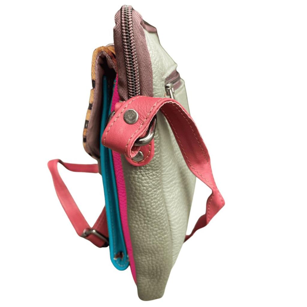 De Leren Schoudertas Pari is een echte blikvanger voor wie houdt van kleur en speelse details. Deze tas combineert turquoise en roze leer met een opvallende luipaardprint op de klep, afgewerkt met beige en bordeauxrode accenten. Net als de andere modellen uit de collectie is de Pari fairtrade geproduceerd in India en gemaakt van hoogwaardig restleer – duurzaam en uniek tegelijk.
