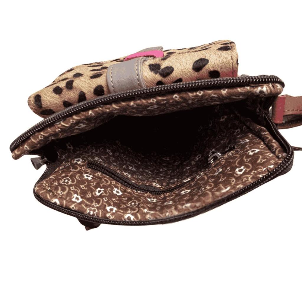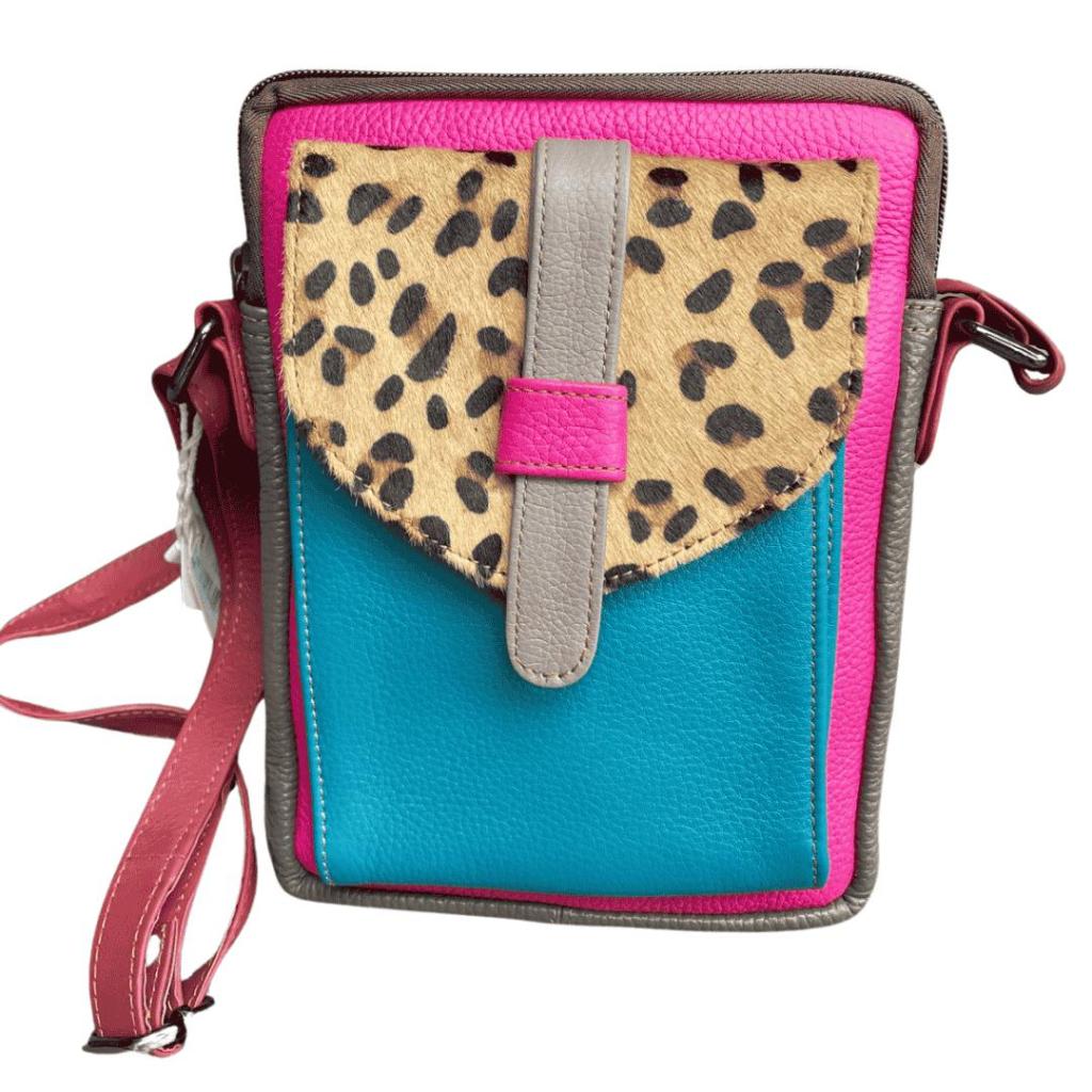 Leren Schoudertas Pari 1 – Turquoise en luipaardprint fairtrade tas van restleer