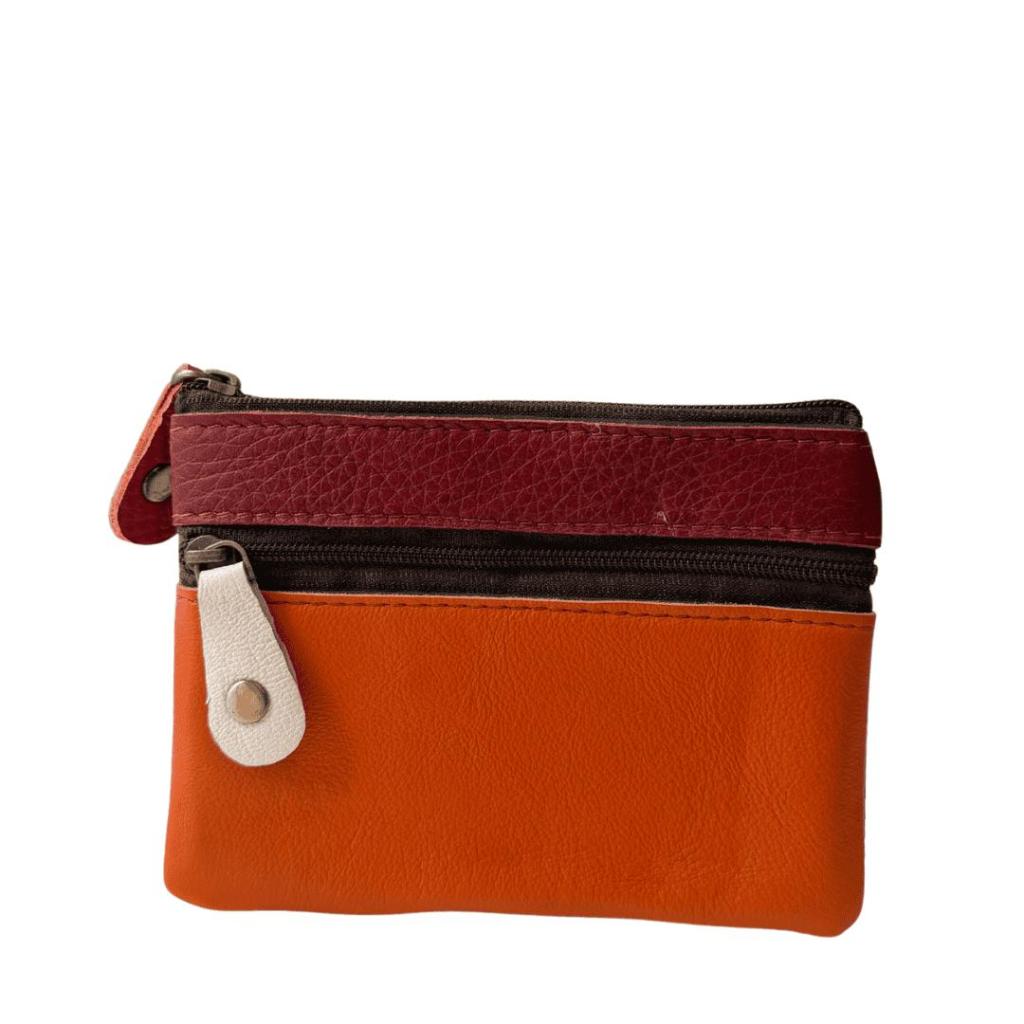 Salena 2 is een compact leren portemonneetje met een uitgesproken kleurencombinatie. De voorkant combineert warm oranje leer met een bordeauxrode bies en een licht detail bij de rits. De achterkant is uitgevoerd in donkergrijs leer, wat zorgt voor een rustig contrast.
