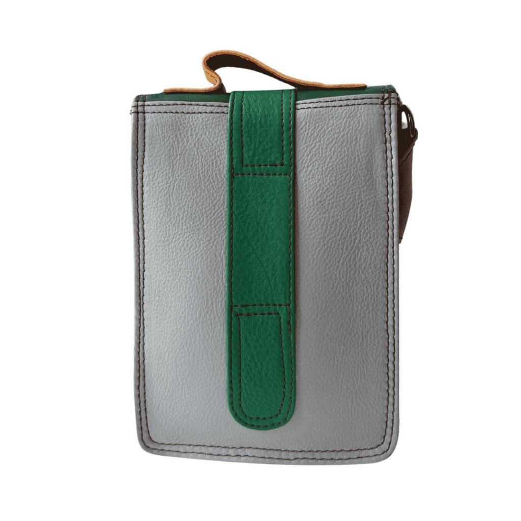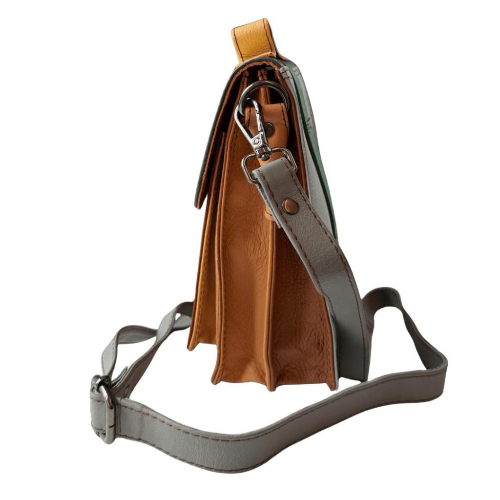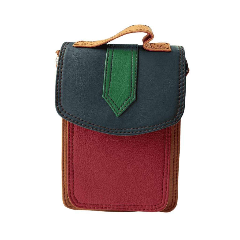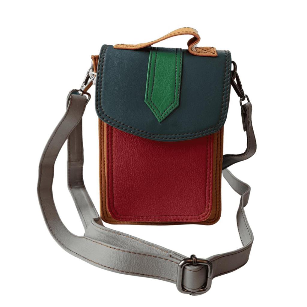 Savita is een compacte crossbody tas die perfect is voor momenten waarop je licht wilt reizen. Deze eerste variant combineert een warm rood voorvak met een grijsgroene klep en een fris groen accent. Klein van formaat, maar opvallend door het kleurgebruik.