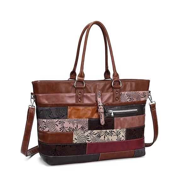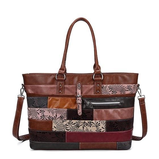 Deze ruime shopper is een echte blikvanger. De tas is opgebouwd uit stroken leer in warme tinten zoals roze, bruin en bordeaux, met subtiele reliëfdetails. Het patchwork-effect maakt elke tas uniek en geeft ’m die fijne, eigenwijze uitstraling.