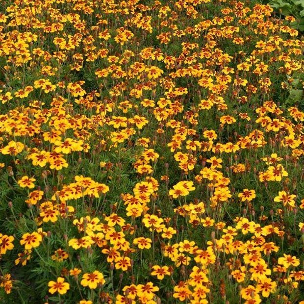Afrikaantje, kleinbloemig heeft enkelvoudige warmgele bloemen met donkere vlekken in het hart. Door de eerste bloemknoppen eruit te knijpen, krijg je vollere planten die meer bloemen leveren. Helpt bodemaaltjes te bestrijden. Geschikt als tussenbeplanting in de moestuin.