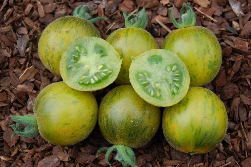 Green Zebra’ geeft zeer bijzondere vruchten van ongeveer 100 gram: onrijp zijn ze lichtgroen met donkergroene strepen en rijp zijn ze geel met groene strepen. Bij volledige rijpheid blijft het zachte vruchtvlees prachtig heldergroen en heeft dan een fijne friszure smaak.De hoofdstengel steun geven en de uitlopers (dieven) in de oksels regelmatig verwijderenmaar.