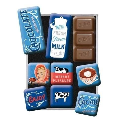 Stap terug in de tijd met deze vintage magnetenset. De retro chocoladeafbeeldingen en de tekst 'Cacao Addicted' geven jouw keuken een nostalgische touch.
