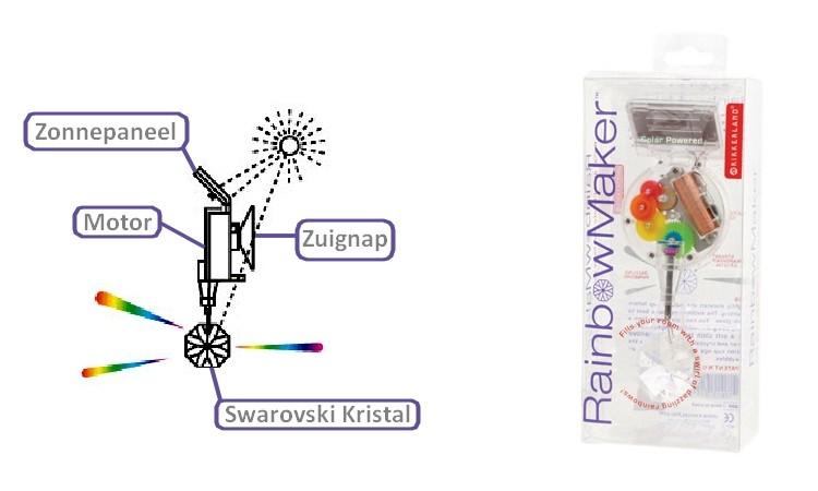 Zelfs de kleinste zonnestralen fleuren je kamer helemaal op met de Regenboog Maker van Kikkerland. Ontworpen door David Dear, een uitvinder met humor afkomstig uit NYC. Hang de Rainbow Maker met de zuignap op aan het raam en laat de regenboog lichtjes dansen door je kamer. Het prismal wordt aangedreven door een motortje werkend op zonne-energie. Leuk cadeau voor jong & oud!