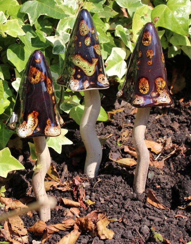 Deze sfeervolle keramieken paddenstoel in punthoedvorm heeft een bijzondere glazuurcombinatie van donkerbruin met gele stippen. Het contrast tussen de geglazuurde hoed en de ongeglazuurde, robuuste steel geeft een natuurlijk en warm effect – perfect voor gebruik in plantenbakken, borders of binnen in een pot.