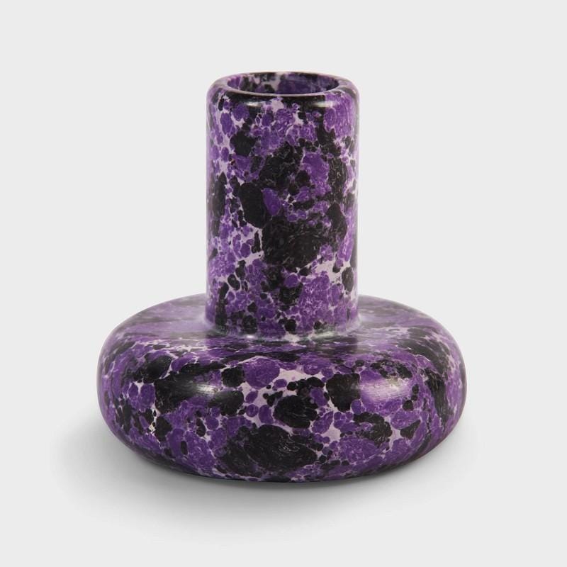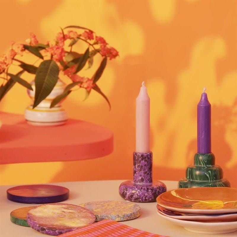 - De kandelaar is gemaakt van een marmerpoeder, verkregen uit gemalen edelstenen, en gecombineerd met hars tot een blok geperst.