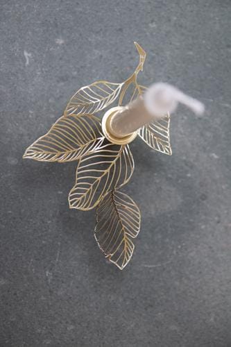 Deze kandelaar Blad van Pluto is prachtig om te zien. Klein en subtiel, zoals zo veel van hun producten. Alleen weggelegd voor liefhebbers die dit kunnen waarderen. Het blokje metaal waar het kaarsje in komt te staan is verzwaard, zodat het goed rechtop blijft. De prachtig gouden dennentak kan je naar eigen inzicht nog enigszins buigen.