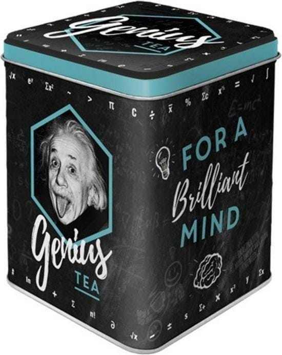 Dit metalen opbergblik is geweldig voor een wijsneus die van thee houdt. Het blik is bedrukt met afbeeldingen van Einstein en wiskundige symbolen. Het formaat is perfect voor losse thee of theezakjes.