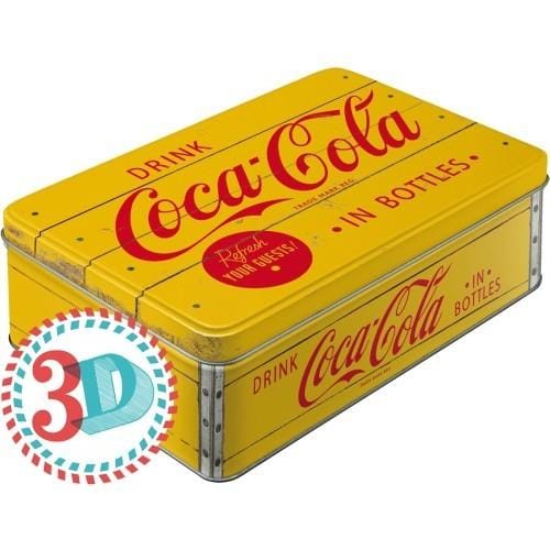 Dit iconische retro blik met het 3D Coca-Cola logo is een must-have voor elke cola-fan. Het gele blik met het bekende rode logo is een echte eyecatcher en perfect om kleine spulletjes in op te bergen.