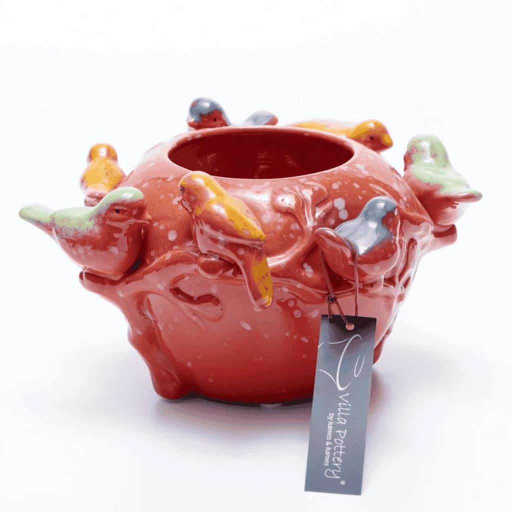 Bloempot Chico 1_2 Rood is een echte eyecatcher voor wie van speels en opvallend houdt. Deze keramieken bloempot heeft een organische, boomachtige vorm en is rondom versierd met kleurrijke vogeltjes die speels op takjes lijken te zitten. De glanzend rode basis met subtiele spikkels zorgt voor een levendige uitstraling en laat de verschillende vogeltjes extra goed tot hun recht komen. Een uniek design van Villa Pottery dat direct sfeer geeft aan je interieur of buitenplek. Ideaal voor kleine plantjes, vetplanten of als vrolijke decoratie op tafel, vensterbank of in een open kast.