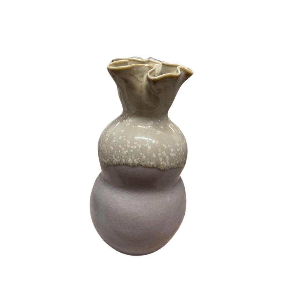 Mini Vaasje Florida Grijs heeft een opvallend speelse vorm die meteen de aandacht trekt. De bloemvormige opening, het gespikkelde beige glazuur en de bolle, matte onderzijde in grijslila maken dit vaasje tot een sierlijk detail in elk interieur. De craquelé afwerking zorgt voor een subtiele textuur en extra karakter.
