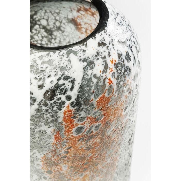 Deze mooie vaas heeft een echte jaren '70 uitstraling. Zowel door de kleursamenstelling als door de gebruikte glazuur techniek. Op de transparante Smoke kleurige vaas is een open glazuur aangebracht van oranje, bruin en wit. Zoals de naam reeds zegt, net een maanlandschap. Een paar takken en bloemen zullen deze vaas nog meer doen schitteren. Verkrijgbaar in verschillende uitvoeringen.