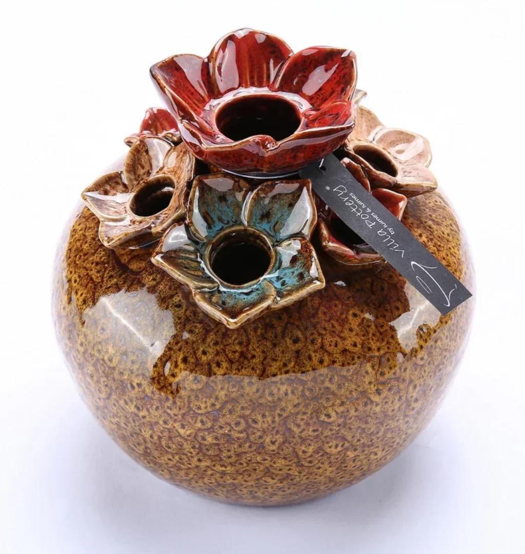 De vaas Springfield 1-2 Geel is een echte blikvanger. De ronde basis heeft een warme geelbruine glazuur met een subtiele, gespikkelde structuur. Bovenop vind je meerdere bloemvormige openingen in verschillende kleuren, waardoor je bloemen speels en los van elkaar kunt schikken. Dankzij de aparte openingen blijven stelen mooi op hun plek. Ideaal voor losse bloemen, korte takjes of een paar opvallende droogbloemen. Zelfs zonder bloemen is deze vaas al een decoratief object op zich. Elke vaas is geglazuurd keramiek en heeft door het bak- en glazuurproces kleine variaties in kleur en structuur. Dat maakt ieder exemplaar uniek.