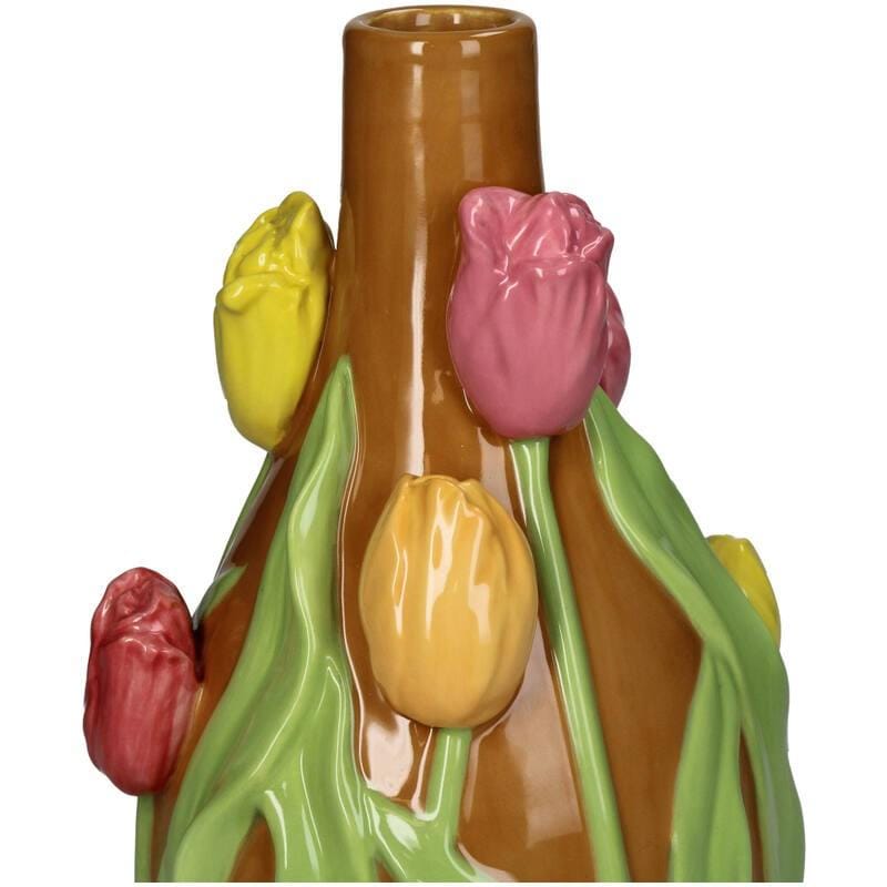 "Breng de warmte en schoonheid van de lente in huis met onze prachtige bruine vaas, met geschilderde kleurrijke tulpen. Met een hoogte van 22 cm voegt deze vaas een vleugje natuurlijke elegantie toe aan je interieur. Beschikbaar vanaf het voorjaar 2024. Haal de vrolijkheid van bloemen in huis!"