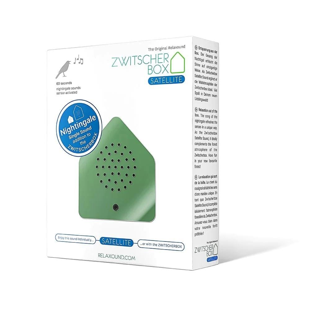Vroeger werden Nachtegalen gevangen om bij mensen thuis in hokjes te kunnen zingen. Gelukkig is dat nu niet meer nodig. Om van het prachtige geluid van deze lijsterachtige te kunnen genieten hoef je alleen maar deze nieuwe relaxound Zwitscherbox thuis op te hangen. Door bewegingsdetectoren worden natuurgeluiden geactiveerd  als je langskomt. Na twee minuten dooft de rustgevende soundscape uit.