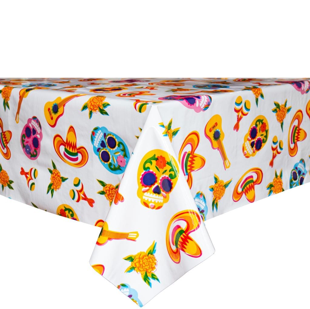 Op een warme zomeravond waan je je met dit tafelzeil even in Mexico. De witte achtergrondkleur wordt opgevuld met illustraties van sombrero's, sambaballen en sugar skulls in warme gele, oranje en groene tinten. Dit tafelkleed is ook beschikbaar in het donkerblauw en in het donkerrood