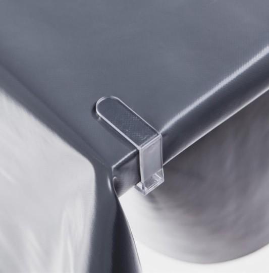 De klemmen zijn gemaakt van stevig PVC en vallen door de transparante kleur nauwelijks op. Je schuift ze eenvoudig over de rand van de tafel en het tafelzeil, zonder dat je het materiaal beschadigt.