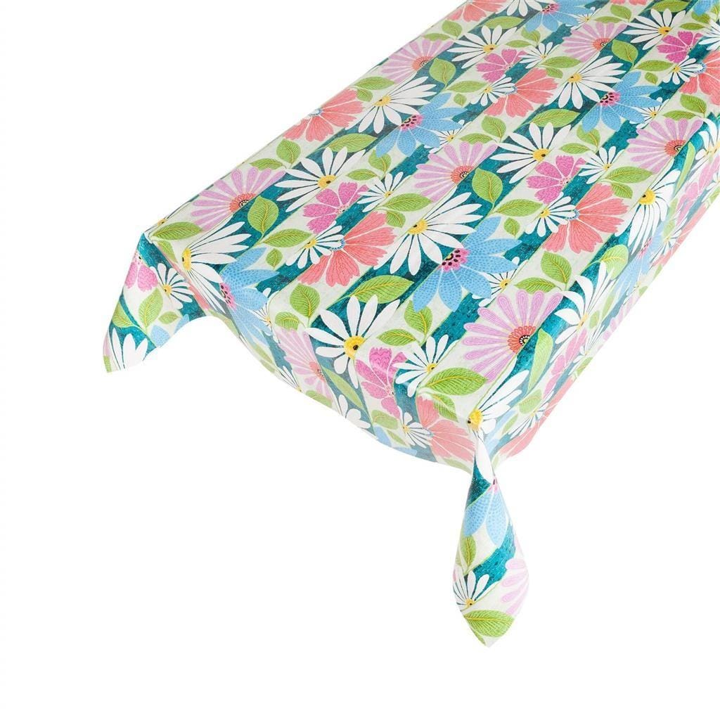 Dit mooie tafelzeil wisselt tussen twee verschillende patronen. De één turquoise met madeliefjes en de ander wit met grote roze bloemen. Door het stevige PVC waar dit zeil van gemaakt is, is het makkelijk in onderhoud en goed schoon te maken.