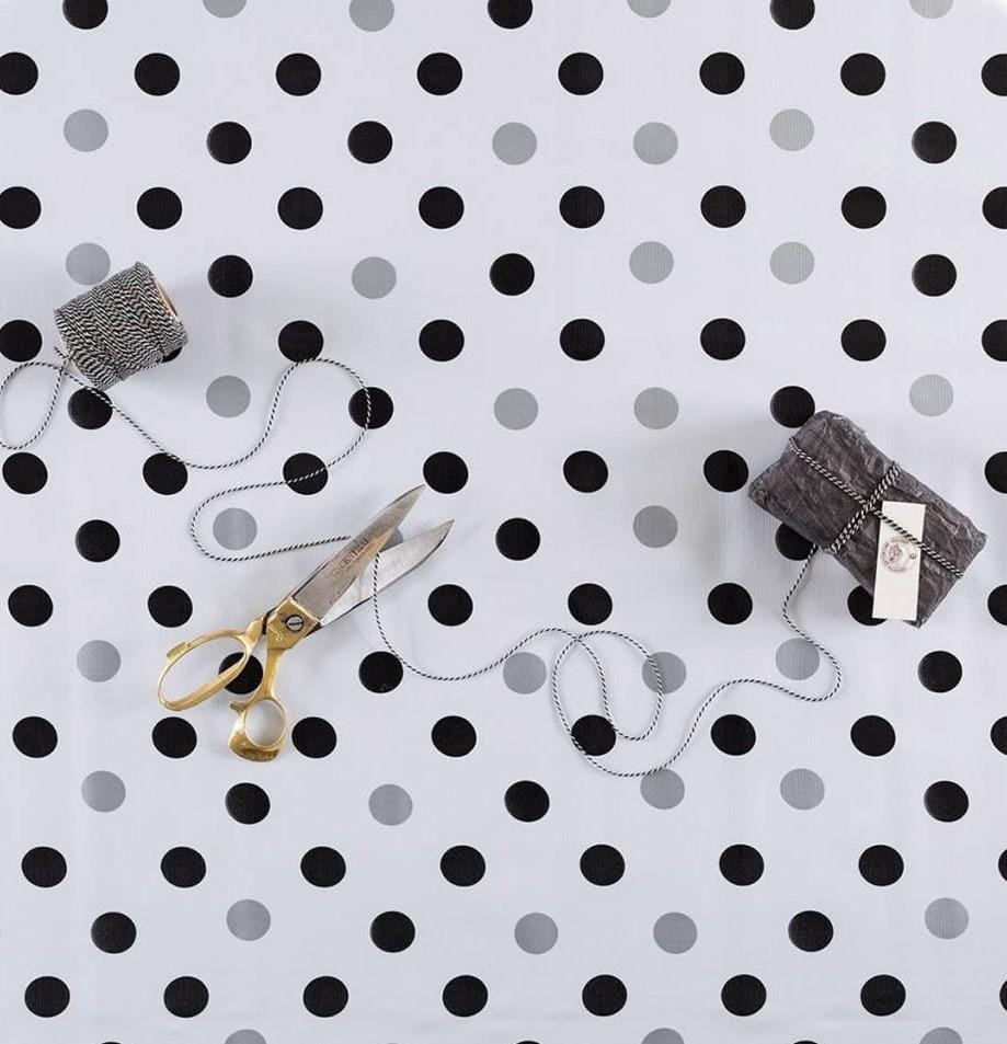Dit tafelzeil heeft een simpel, maar elegant patroon van zwarte en zilveren stippen tegen een witte achtergrond. Dat staat prachtig tijdens bijvoorbeeld een kerstdiner of in een modern ingerichte woonkamer.