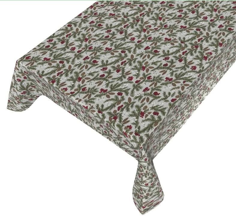 Creëer een warme en gezellige sfeer met dit grijze tafelzeil met een vleugje natuur. De kleine kerstboomtakjes, witte bloemetjes en rode besjes geven het zeil een rustieke uitstraling, perfect voor een traditionele kerstviering.