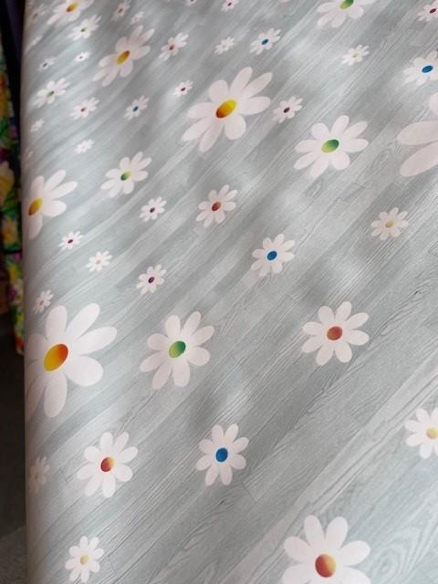 Zomers tafelzeil van vrolijke margrietjes op een grijze achtergrond. Leuk dat de bloemen in verschillende maten zijn afgebeeld met verschillende kleurtjes in het hart. Het zeil is 140 cm breed en kan per 10 cm worden besteld. De productfoto's van de leverancier blijken nogal af te wijken van de daadwerkelijke kleur, vandaar de extra foto's.