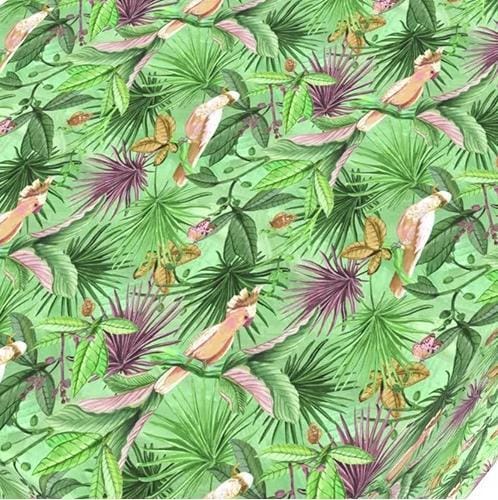 Tropische sferen voor op je tafel. Met dit kleurrijke tafelzeil haal je de Amazone in je huis. De lichtroze papagaaien voelen zich thuis tussen de groene bladeren van de palmbomen. Het zeil is 140 cm breed en kan per 50 cm worden besteld.