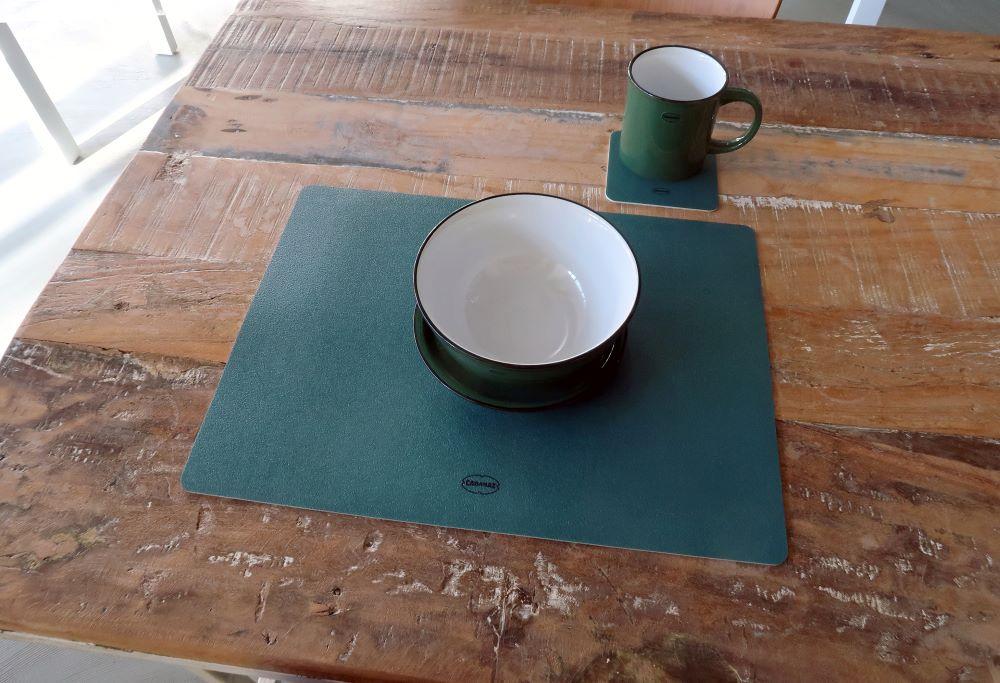 De Cabanaz Onderzetters Set van 4 Donkergroen combineert functionaliteit met stijlvolle eenvoud. Gemaakt van duurzaam leatherlook PVC, eenvoudig schoon te maken en geschikt voor dagelijks gebruik. De donkergroene kleur vormt een rustige basis en laat zich perfect mixen met het bekende Cabanaz servies en bijpassende placemats.
