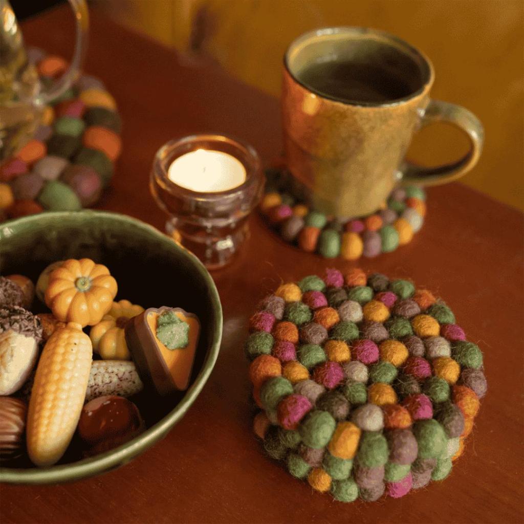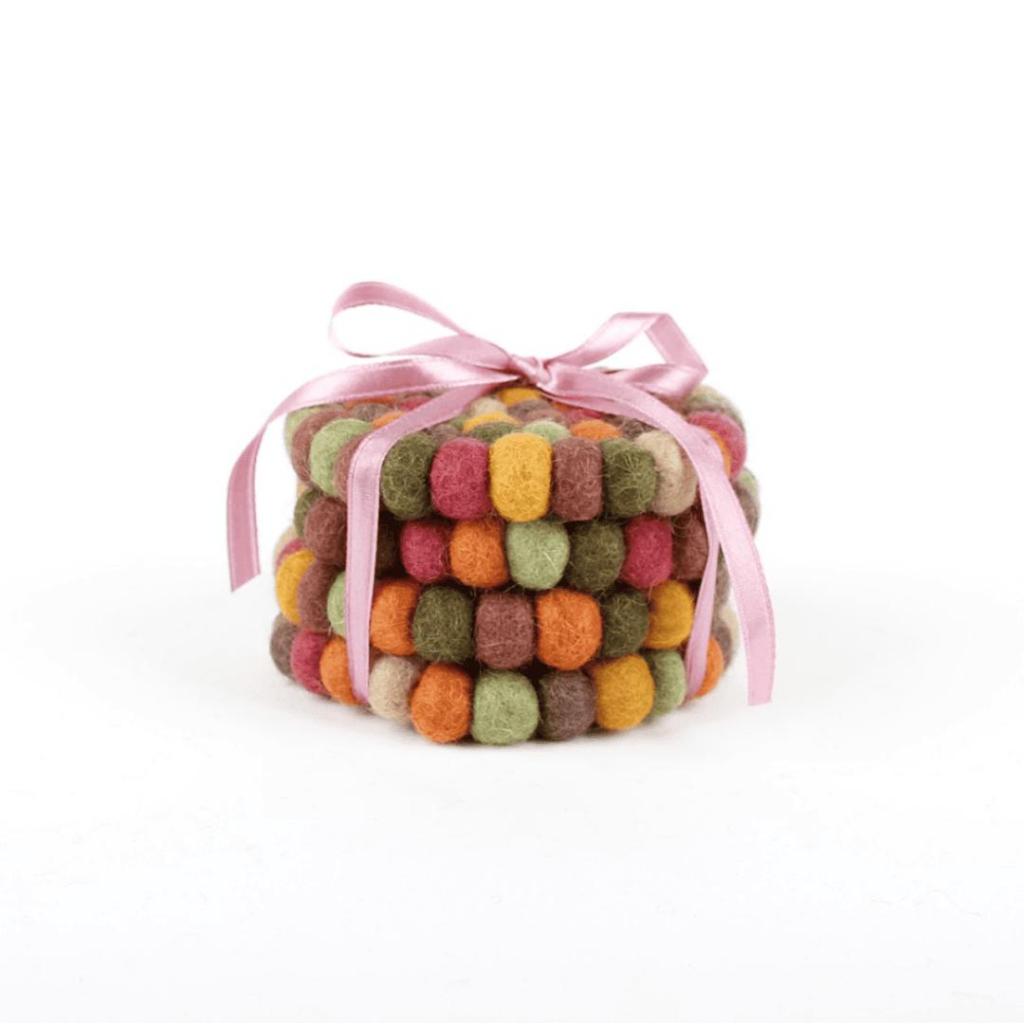 Deze set van vier handgemaakte vilten onderzetters brengt direct warmte en kleur op tafel. De onderzetters zijn opgebouwd uit kleine wolvilt balletjes in mooie aardetinten, waardoor ze een gezellige, natuurlijke uitstraling hebben. Met een diameter van 10 cm zijn ze ideaal voor glazen, mokken en kleine kommen.